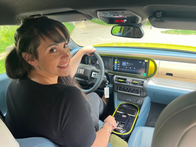 Pia Cammertoni, franco-italienne et gérante de l’épicerie-cavetraiteur Pia Vino à Nantes, a été conquise par cette Grande Panda « La Prima », version la plus équipée et la plus exclusive de cette citadine lookée et pleine de surprises, lors de l’essai, près de la Chaussée des Moines à Vertou.
