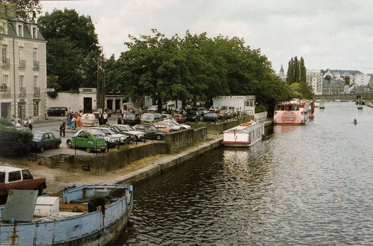 Anciennement « chaussée de Barbin », construite au VIe siècle par Saint Félix, évêque de Nantes, puis petit port actif inauguré en 1880, le quai de Versailles voyait débarquer sur ses pavés des marchandises que l’on chargeait en direction du centre-ville, en croisant de nombreuses blanchisseuses sur les fameux bateaux-lavoirs. Ce cliché, réalisé à l’aube des années 90 révèle un lieu au charme désuet, mis en valeur par la présence de l’Erdre, et toujours très apprécié des Nantais. On y distingue aisément de nombreux modèles d’automobiles qui semblent elles aussi contempler le cours d’eau : 2CV, Renault Espace, Renault 4L, Renault Master, Volvo 940 Break et bien d’autres… prêtez-vous au jeu !