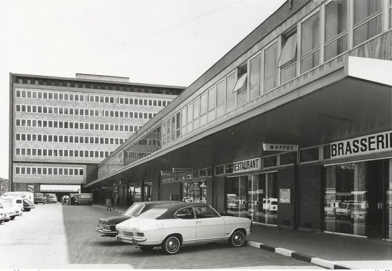 Bienvenue en gare de Nantes, embarquement direction… le passé ! Sur ce monochrome daté de 1971, on observe l’accès nord de la gare de Nantes, construite au milieu du XXe siècle en remplacement de l’ancienne gare de Nantes-Orléans endommagée par les bombardements. S’en suivront d’importants réaménagements dans les années 1980, avec l’arrivée du TGV, puis en 2015 sous la direction de l’architecte Rudy Ricciotti, pour aboutir à la gare que nous connaissons maintenant. On distingue ici, en plus de la facilité de stationnement et d’accès, des véhicules typiques des seventies : Opel Kadett Olympia B 1700 coupé, Mercedes 280 se, Citroën TUB, Renault 4l fourgonnette… un large panel !