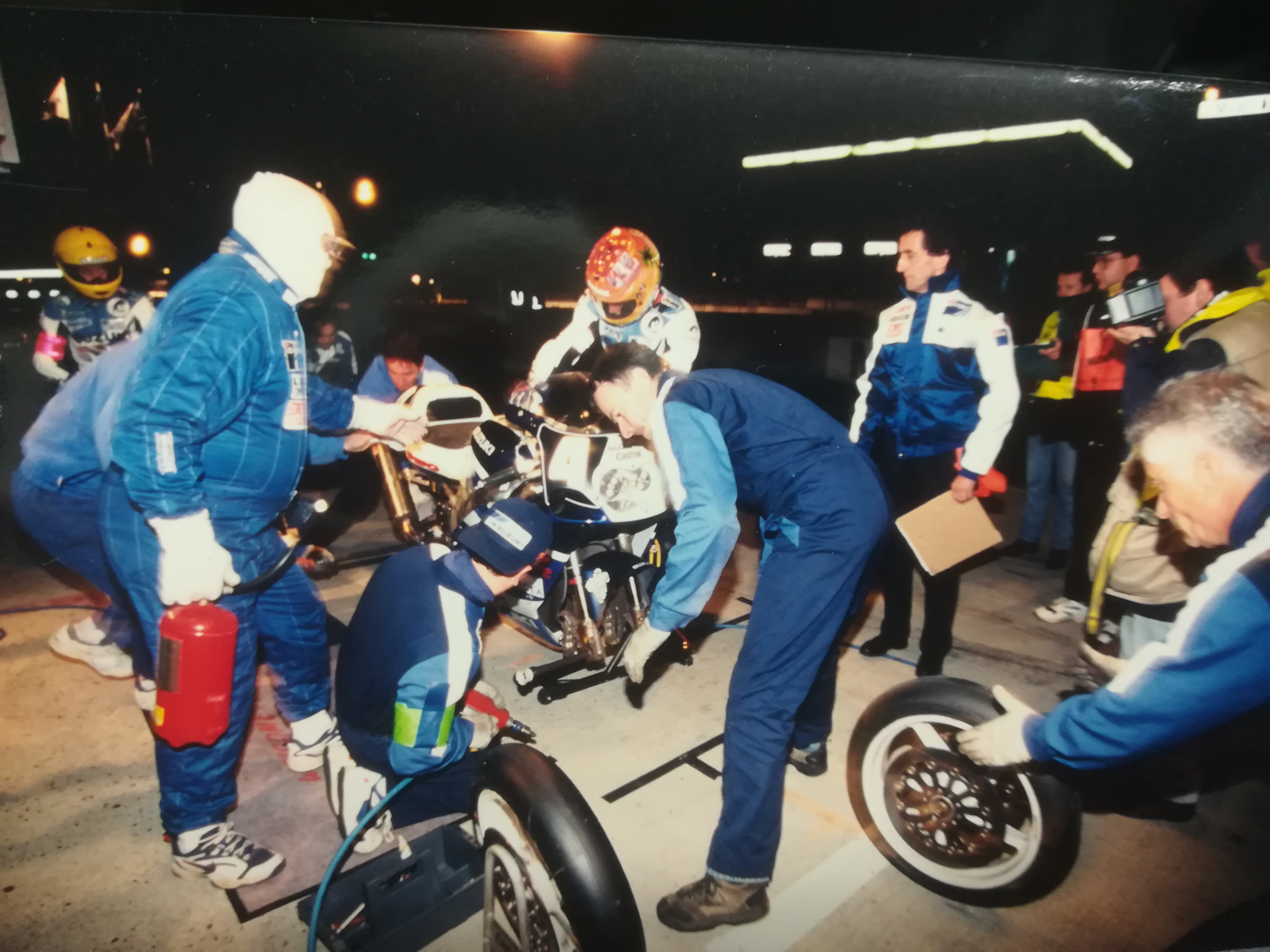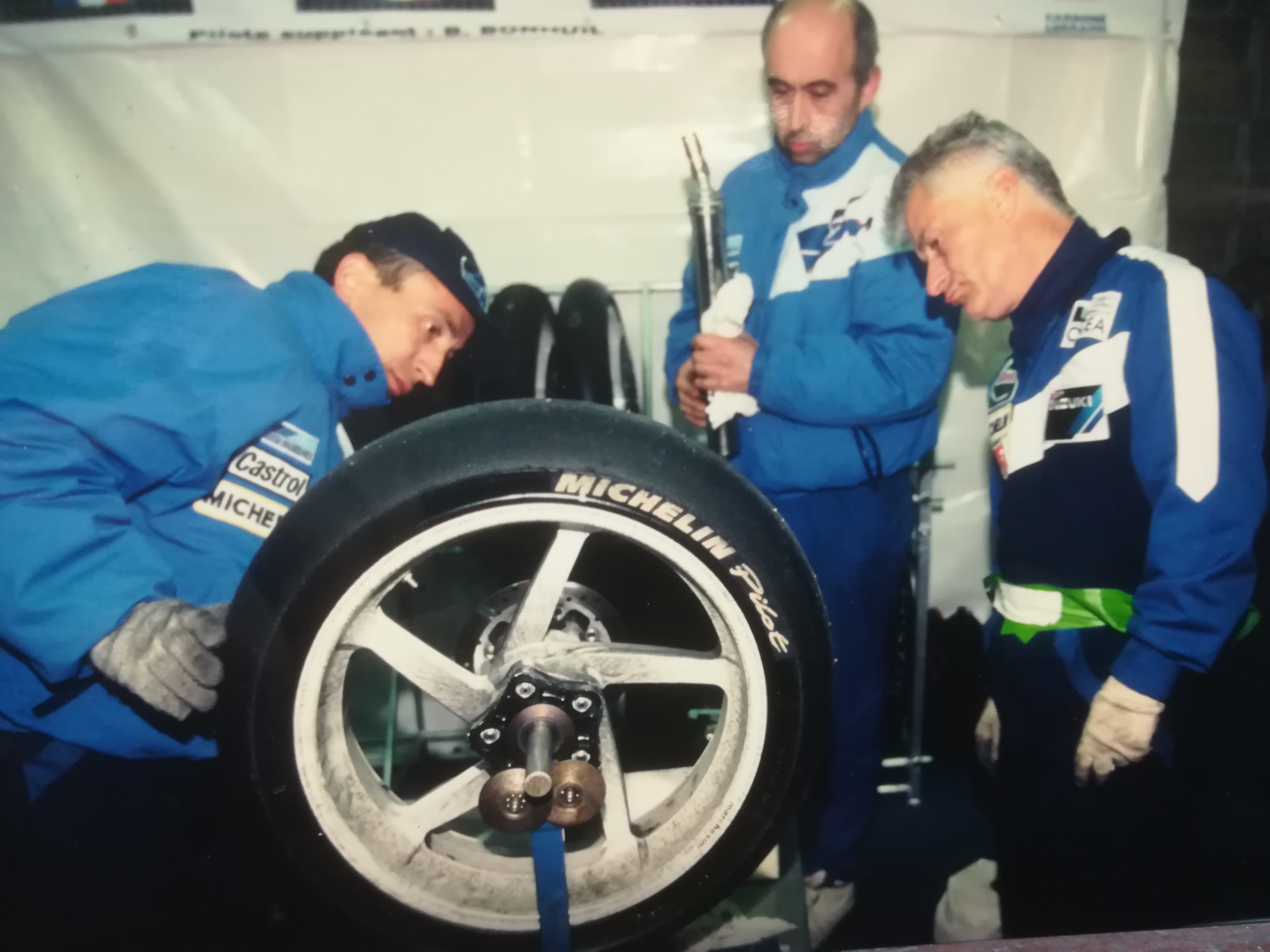 Affecté à la gestion des pneumatiques sous la supervision de l’ingénieur, Alain s’assure que les roues sont prêtes à être montées à chaque instant. « Le pneu est le seul élément qui fait le lien entre le bitume et la moto. Sa pression doit être optimale et parfaitement calibrée car il est soumis à de nombreuses contraintes. Je devais donc la régler à froid puis à chaud et contrôler le glissement du pneu sur la jante. C’est un travail très éprouvant aussi bien physiquement que mentalement. J’étais vraiment dans ma bulle et, personnellement, je ne dormais pas du week-end car le pilote pouvait rentrer au stand à tout moment », détaille Alain, en qui les pilotes avaient une confiance aveugle. À la question de son meilleur souvenir, l’Orléanais répond sans hésiter les 8H de Suzuka, au Japon, la Mecque de l’endurance où, chaque année, tout le gratin de la moto est présent.