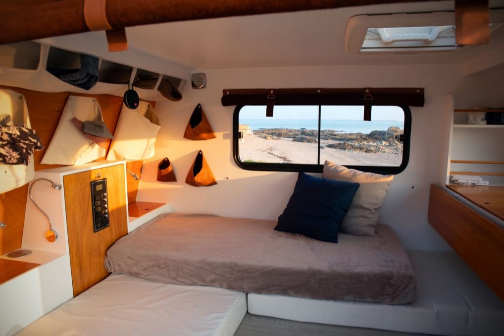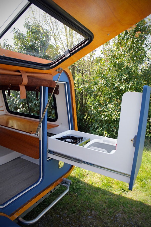 Qu’à cela ne tienne, les deux passionnés de microarchitecture décident de concevoir leur propre moyen d’escapade. « L’idée était de créer un espace pour dormir, manger, cuisiner, qui soit aussi agréable par beau temps que par une météo mitigée. Nous voulions une cuisine accessible de l’extérieur comme de l’intérieur, de grandes baies pour profiter du paysage », indiquentils. Les deux amis s’inspirent de la teardrop trailer (caravane en forme de larme) née dans les années 30 aux États-Unis et y apportent tout leur savoir faire en matière d’optimisation de l’espace.
