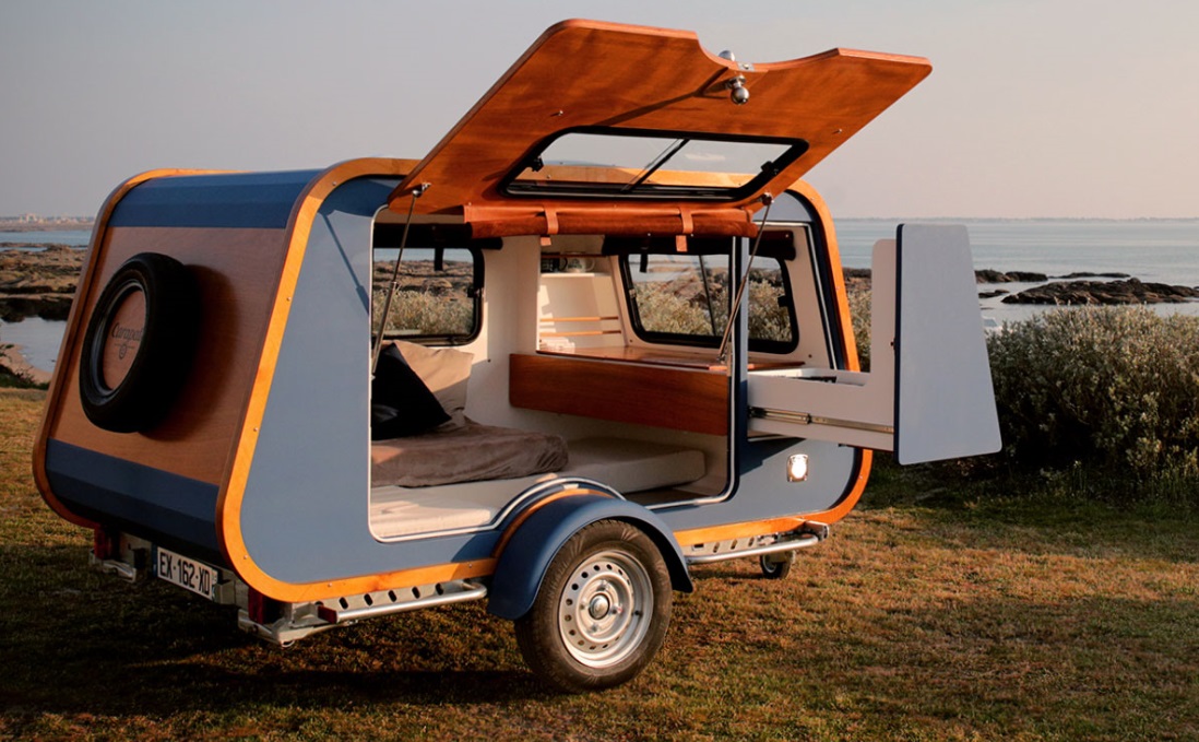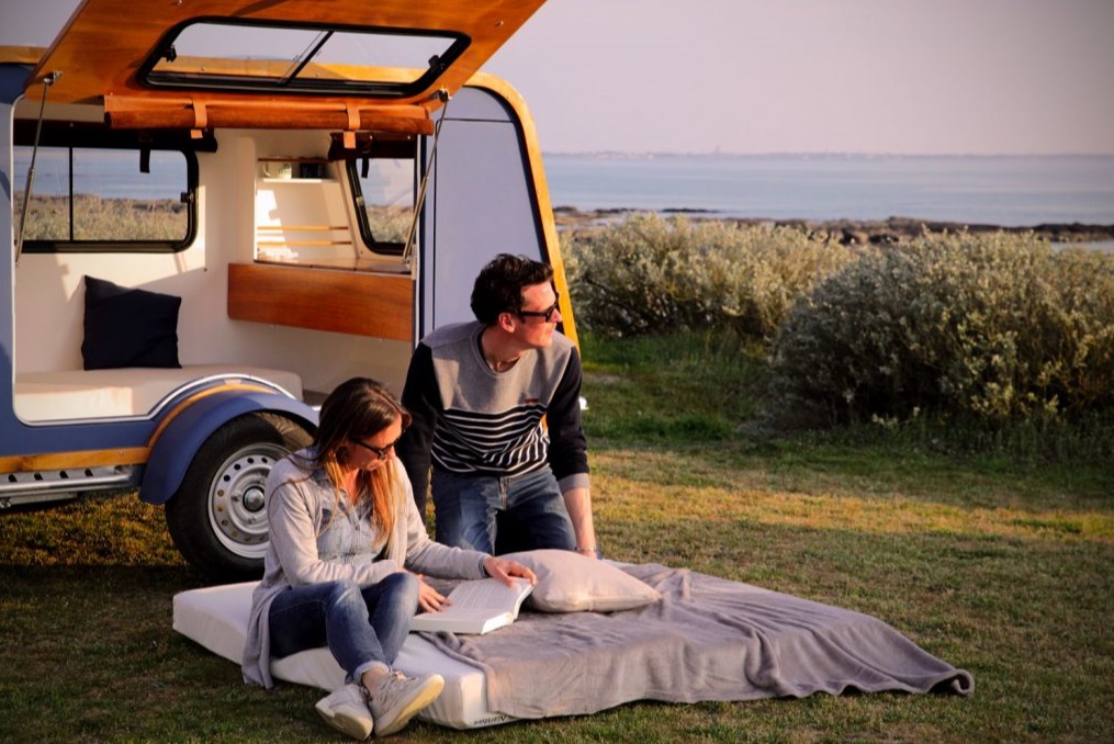 Fabien et Jean-Marie sont partis d’une base de remorque, sur laquelle ils ont posé une structure en bois, naturellement isolante. Grâce à des systèmes de tiroirs, leur mini-caravane nommée Carapate, permet de cuisiner en intérieur comme en extérieur et les trois matelas de 140×64 cm se transforment au besoin en lit pour la nuit, en canapé pour la journée et même en banquettes détachables pour une sieste en extérieur grâce à un revêtement étanche. Leur premier modèle, présenté en avril au salon du véhicule d’aventure, à Corcoué-sur-Logne, a été accueilli très favorablement. « La société vient juste d’être créée, nous allons ouvrir les commandes dans le courant de l’été », indiquent les deux Nantais. Le tarif de base sera de 14 000€ et il faudra compter 18 000€ pour une Carapate tout équipée.
