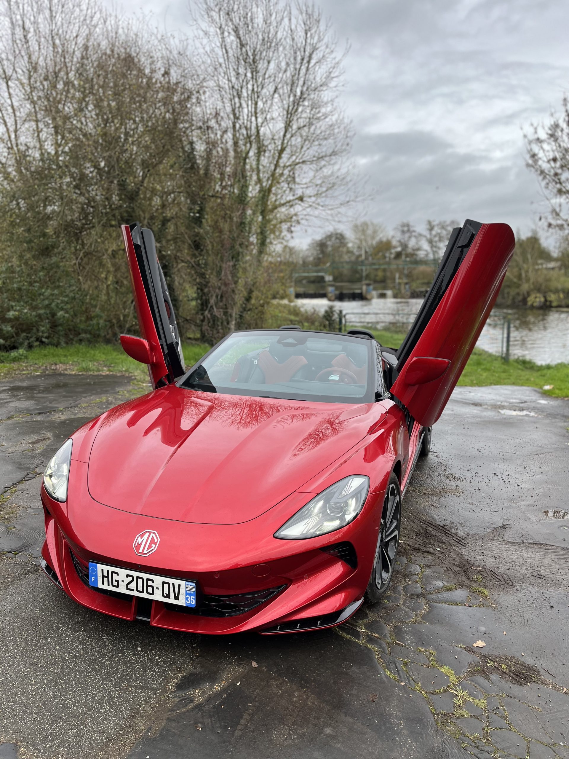 Pour célébrer le centenaire de la marque, MG bouscule l’univers du véhicule électrique en déclinant un roadster sportif. Il le dote d’une motorisation 100% électrique qui développe 510 ch avec un couple de 725 Nm assurant le 0 à 100 km/h en 3,2 sec pour la version quatre roues motrices, notre modèle d’essai. L’ensemble est alimenté par une batterie de 77kWh offrant une autonomie de 443 km.