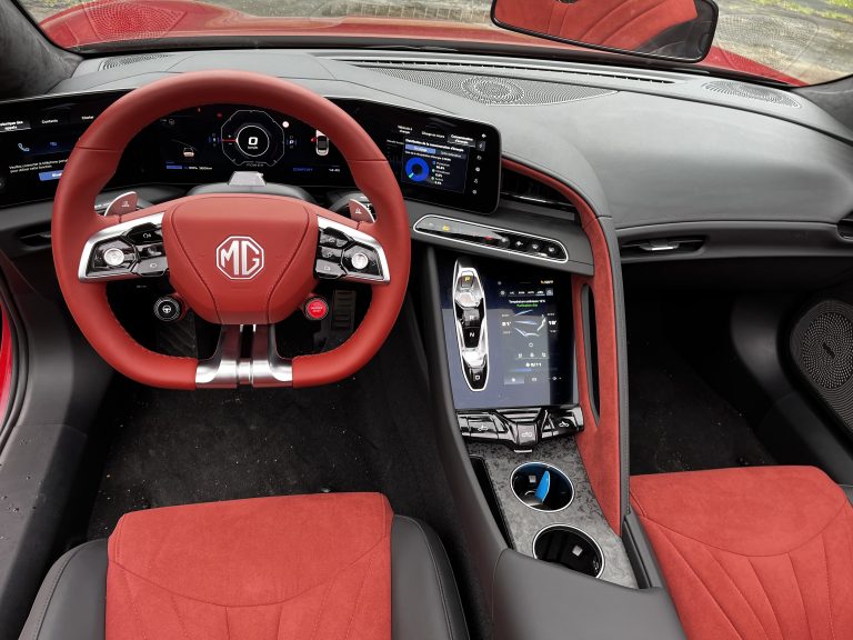 Attirant, le Cyberster sait accueillir ses deux passagers, exposant le savoir-faire de la marque. MG associe finitions haut de gamme avec un espace conducteur dominé par trois écrans. « L’intérieur, qui allie cuir et matériaux nobles, est magnifique. Les finitions du Cyberster sont remarquables. Une fois sur la route, la voiture est silencieuse, confortable. Au volant, les informations sont lisibles, les commandes sont accessibles et simples ».