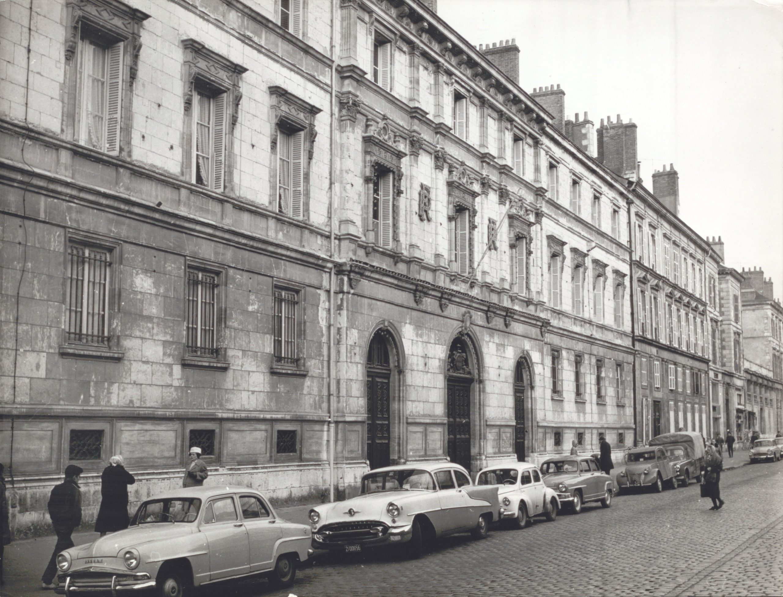 Nous voici rue Jeanne d’Arc, au lendemain de la Seconde guerre mondiale. Rue pavée, voitures en stationnement : pas de doute, nous sommes loin de l’artère aujourd’hui longée par la ligne de tram ! Autre incongruité à nos yeux de contemporains : la façade du célèbre lycée Pothier que l’on discerne au second plan. Rue Jeanne d’Arc ? Si de nos jours, l’établissement accueille ses élèves rue Marcel Proust, il était effectivement situé dans l’hypercentre d’Orléans jusqu’au début des années 60, époque à laquelle il s’ouvrit d’ailleurs à la mixité. Au premier plan, on distingue une Simca Aronde du début des années 50, suivie d’une Oldsmobile 88 et d’une bonne vieille Renault 4 CV. Le genre de voitures que les lycéens de l’époque, à la sortie de leur cours, rêvaient alors sûrement de conduire le plus tôt possible !