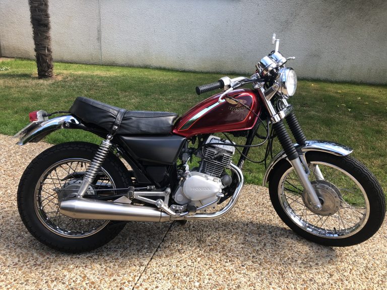 Ce modèle des années 90’s très réputé pour sa grande fiabilité et la souplesse de son moteur bicylindre 4 temps ne fait pourtant pas l’unanimité d’un point de vue esthétique dans sa version shopperisée d’origine. Alors qu’avec ces quelques améliorations (une selle de Honda SL des années 70’s, un phare avant chromé et un feu arrière Lucas, un covering des caches latéraux en noir mat, des silencieux d’échappement Triumph, des soufflets de tubes de fourche, des amortisseurs arrières Koni, un petit rétroviseur design, un guidon droit classique et une paire de pneus Bridgestone), il est tout de suite un peu plus présentable !
