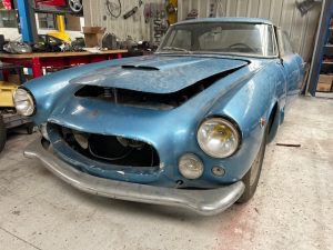 Depuis 1973, Provost Automobiles donne une deuxième jeunesse à des véhicules qui en ont bien besoin, comme ces deux italiennes radicalement opposées. Ce châssis est celui d’une Maserati 3500 GT, identifiable à sa structure tubulaire Superleggera signature du carrossier Touring. « Toutes les parties attaquées par la rouille sont découpées puis refaites (pièces grises sur la photo) selon les cotes pour donner une nouvelle vie à la voiture », explique Frédéric Provost, gérant de la maison. Entrée dans un piteux état, il faudra environ 1400 heures de travail, en carrosserie et en mécanique, aux artisans pour remettre d’aplomb ce joli coupé qui le mérite tant. Ce Vespa aussi a connu les services de la maison. « C’est un 150 Grand Sport Série 1 fabriqué sous licence en Allemagne dans l’usine Messerschmitt. Il a été restauré ici en 2003 ». À ses côtés, un mannequin pose dans la combinaison des essayeurs Vespa avec un casque, lui aussi d’époque et de style latin.