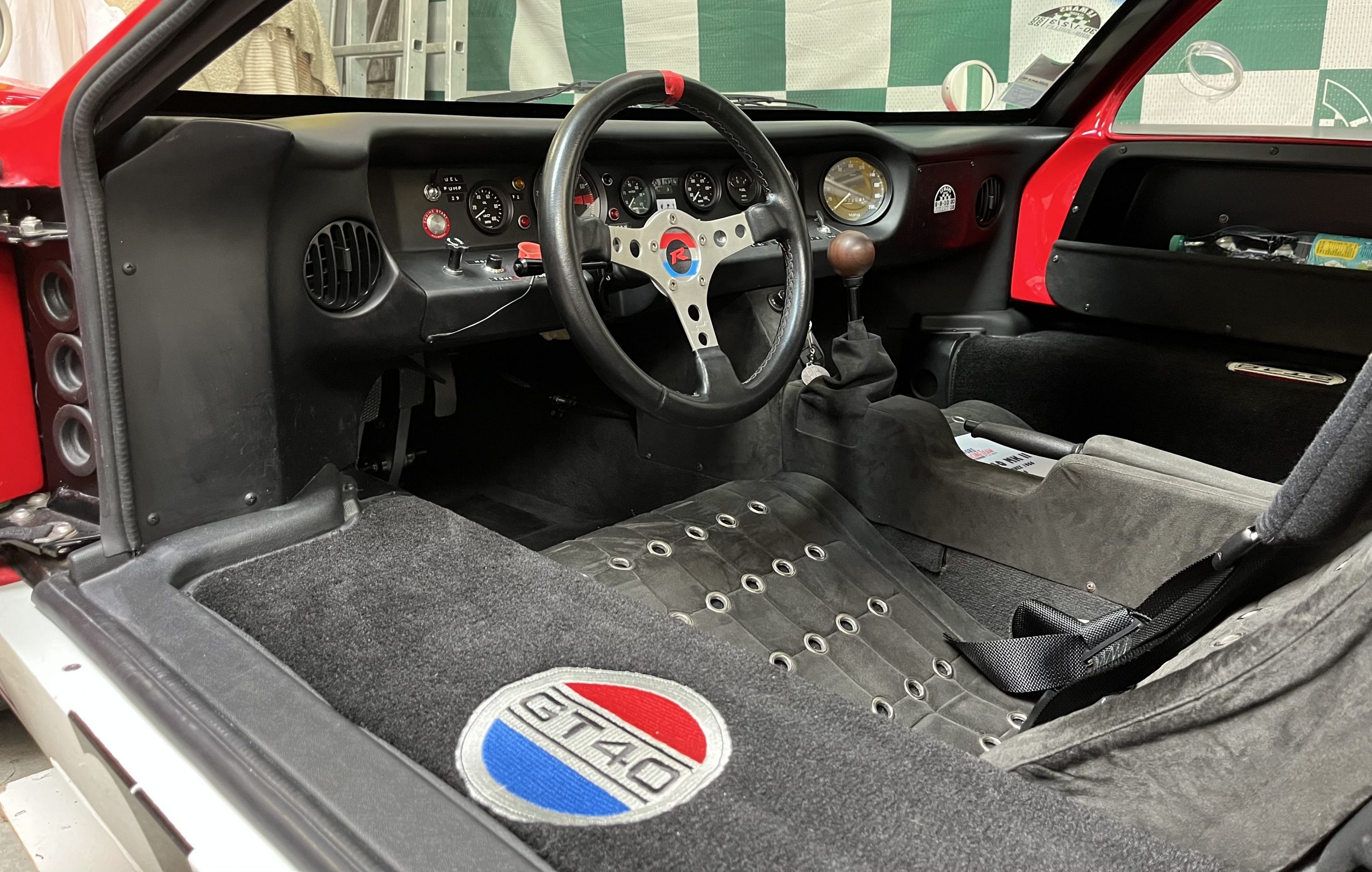 Cet exemplaire n’est pas une réplique moderne mais bien issu d’une des premières séries de GT40. « Elle est fidèle à 95% à celle de course. Les seuls éléments qui diffèrent sont la position du volant (c’était une voiture anglaise, ne l’oublions pas), le moteur à injection et pas à carburateurs et les quelques éléments recouverts de moquette à l’intérieur ». Sans la moquette, c’est l’acier du châssis qui est laissé apparent… Assurément, une vraie voiture de course, mais immatriculée ! « Il fallait en construire un certain nombre pour l’inscrire dans le championnat GT, Grand Tourisme. Le 40 de son nom fait référence à sa hauteur en pouces ». La livrée, de couleur rouge et réhaussée de deux bandes blanches sur toute sa longueur et portant le numéro 3, est fidèle à celle de Jerry Grant et Dan Gurney, le pilote qui en 1966 signa la pôle position. « Adolescent, je les ai vues rouler devant moi. Aujourd’hui, il m’arrive de les piloter sur circuit pour des baptêmes de piste ».